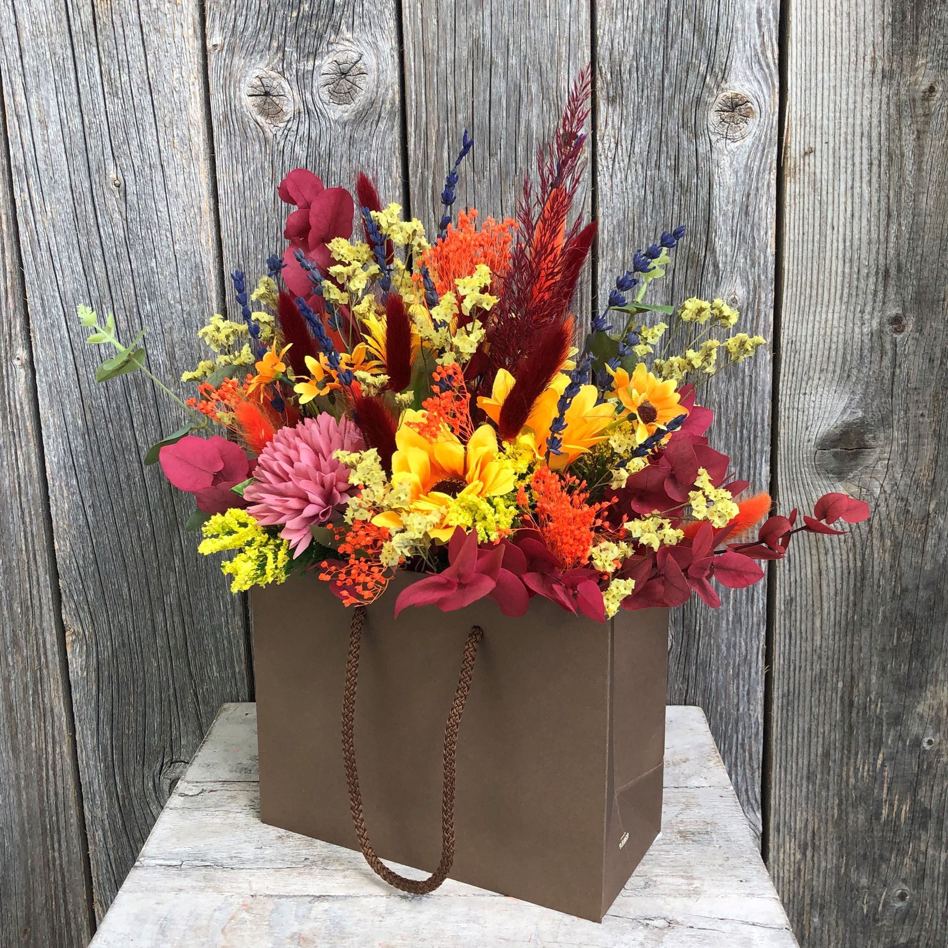 Avec ce cadeau tendance, la surprise sera inoubliable. Notre sac à fleurs est conçu avec des fleurs séchées et des fleurs textiles très tendance.