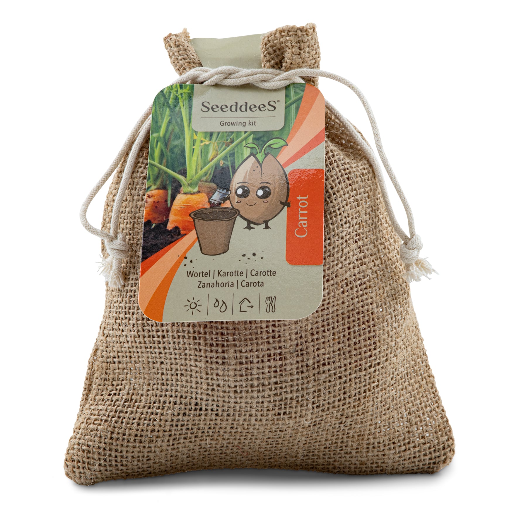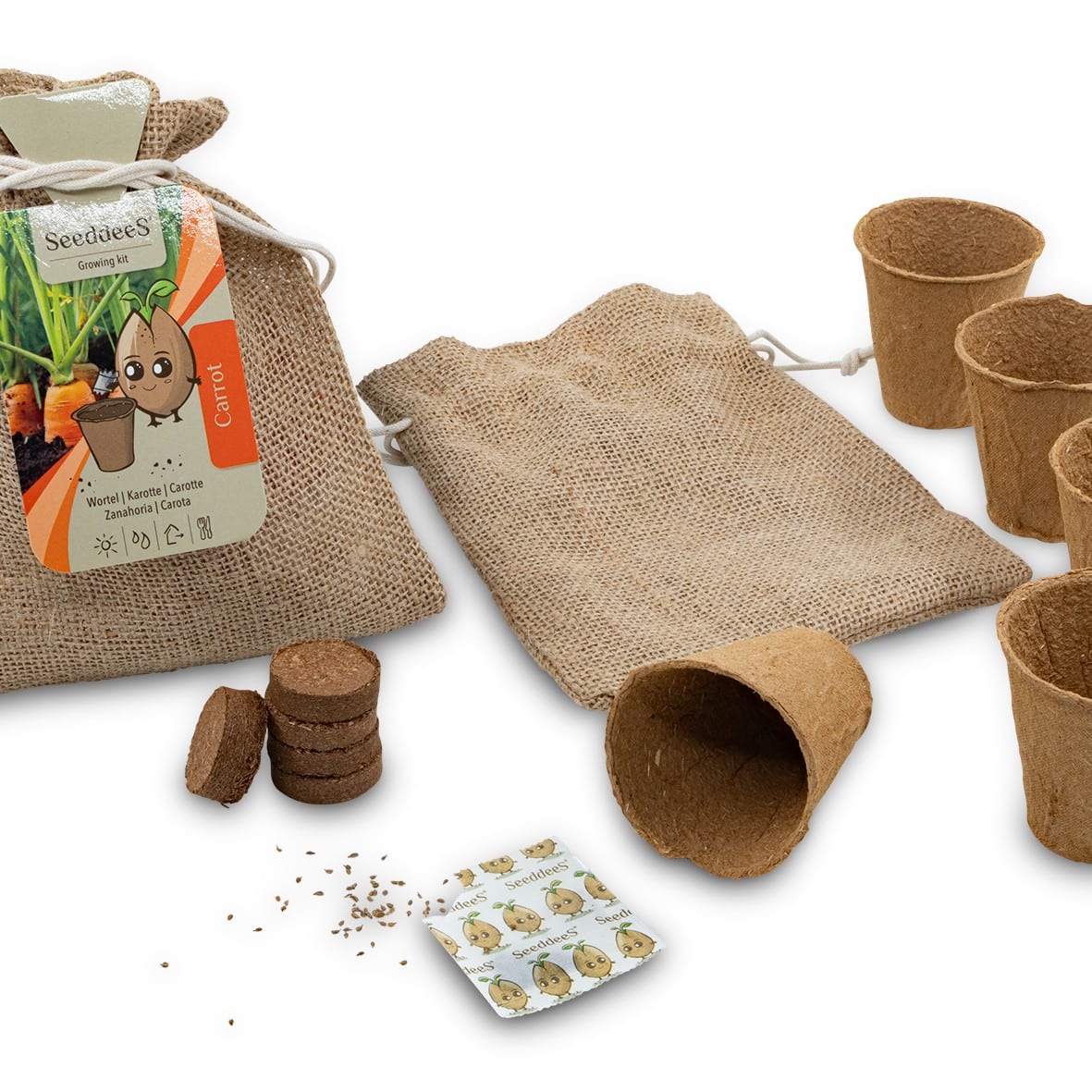 CONTIENT : Sac en jute avec pot biodégradable (4x), plaquette de coco (4x) et graines de carotte (4x).