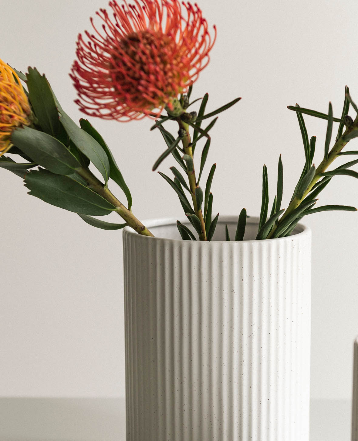 Vase moderne en blanc au style épuré avec un léger motif de combustion brun et une surface lisse. Ce vase simple s'intègre merveilleusement bien dans n'importe quelle maison et est disponible en deux tailles, ce qui permet de créer des combinaisons particulièrement jolies.