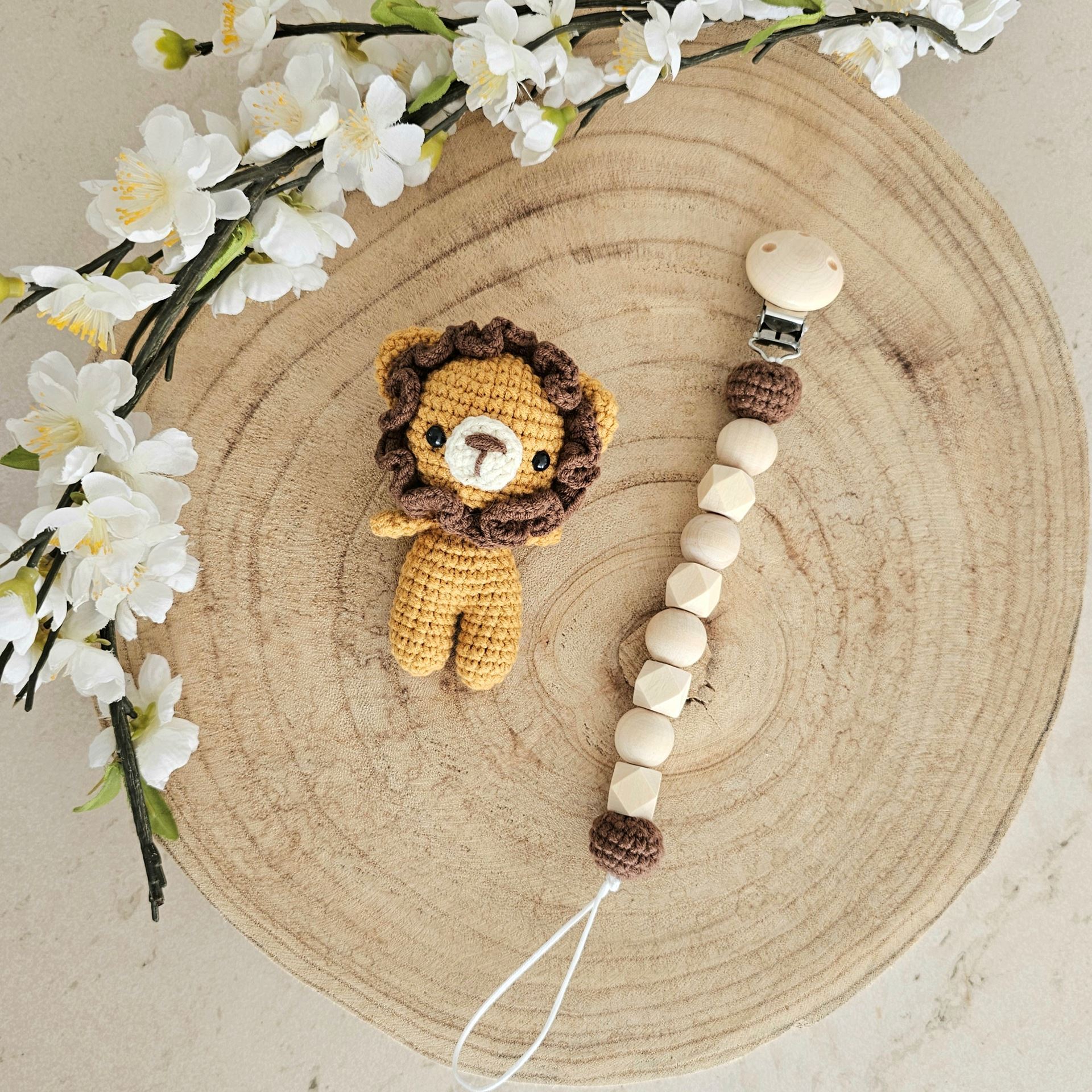 Notre set de 2 lions est le cadeau idéal pour une naissance, un baptême ou une fête de bébé. Il contient une attache-tétine et un mini lion au crochet.