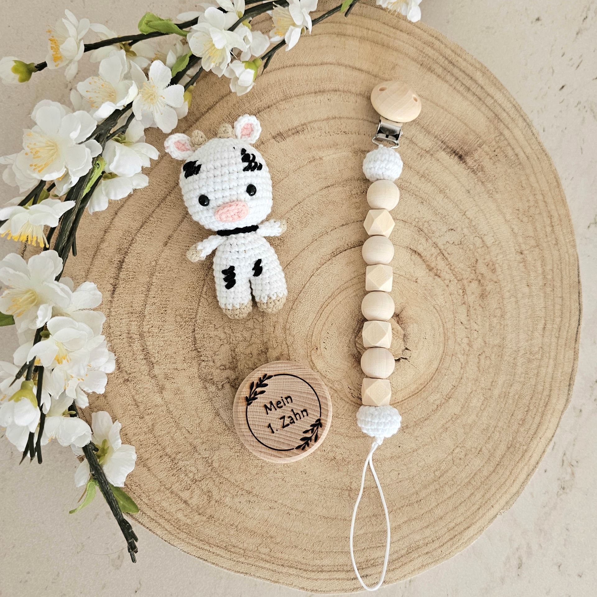 Notre set de 3 vaches est le cadeau idéal pour une naissance, un baptême ou une fête de bébé. Il contient une attache-tétine, une mini-vache au crochet et une boîte à dents.