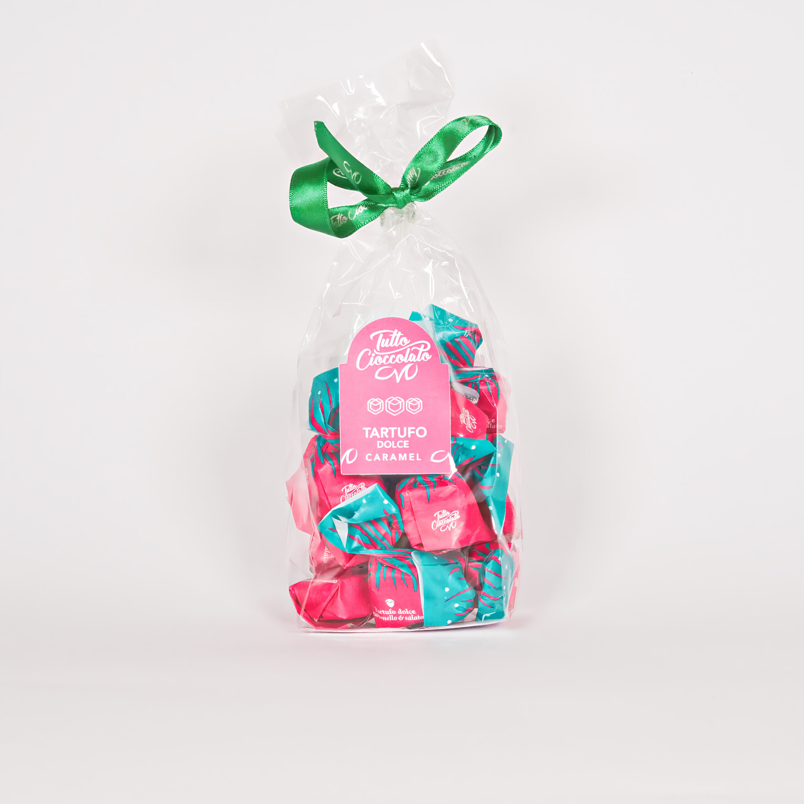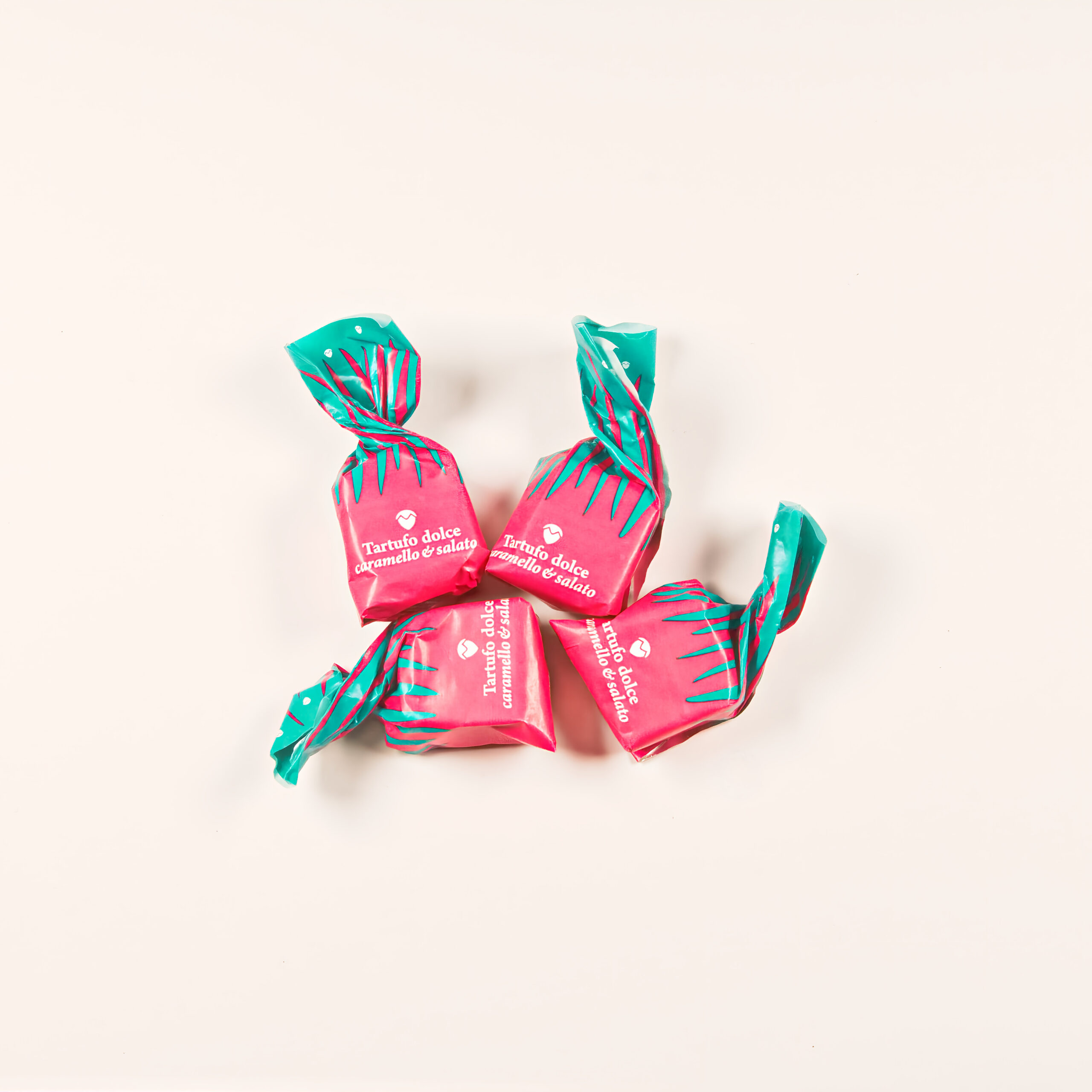 Tartufo blanc au caramel salé . Tartufi fait main à base de chocolat blanc, de crème de noisettes blanches et de noisettes entières - agrémenté de caramel, de beurre salé et d'une pincée de sucre en poudre.