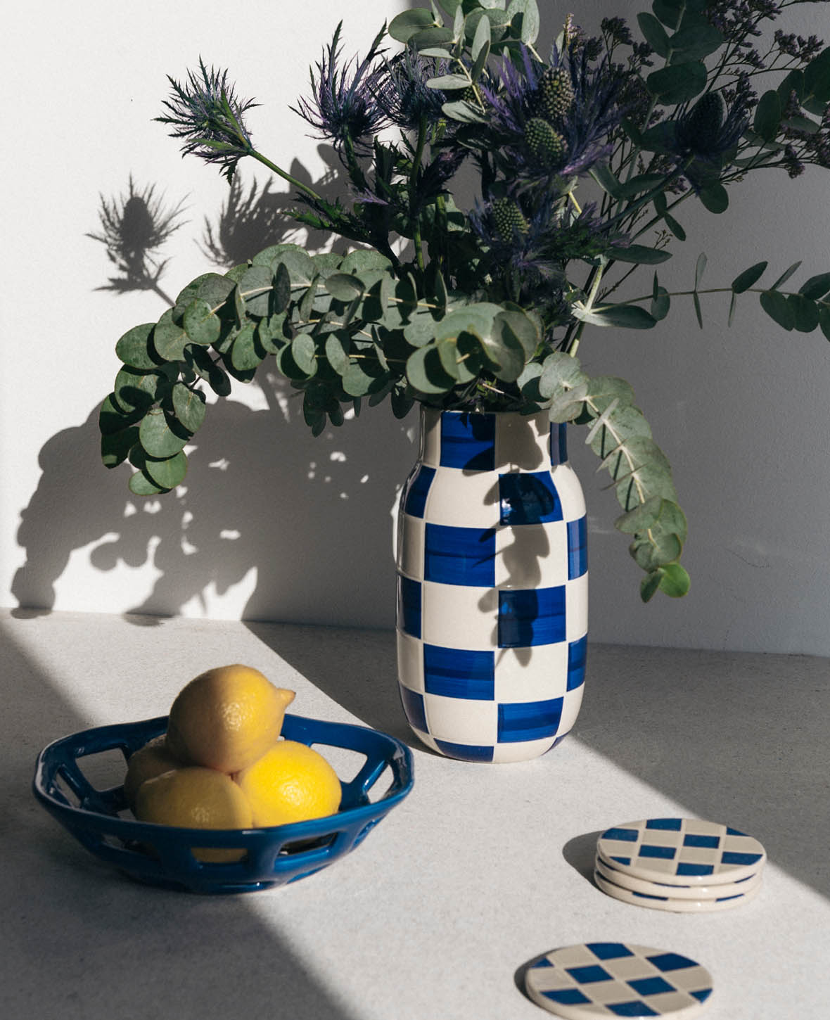Vase en céramique à carreaux bleus et blancs, H 25 cm x Ø 14 cm