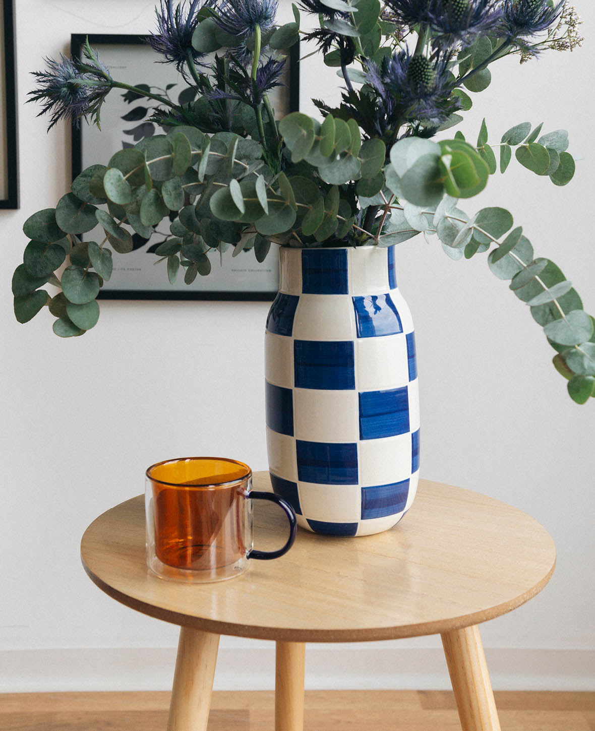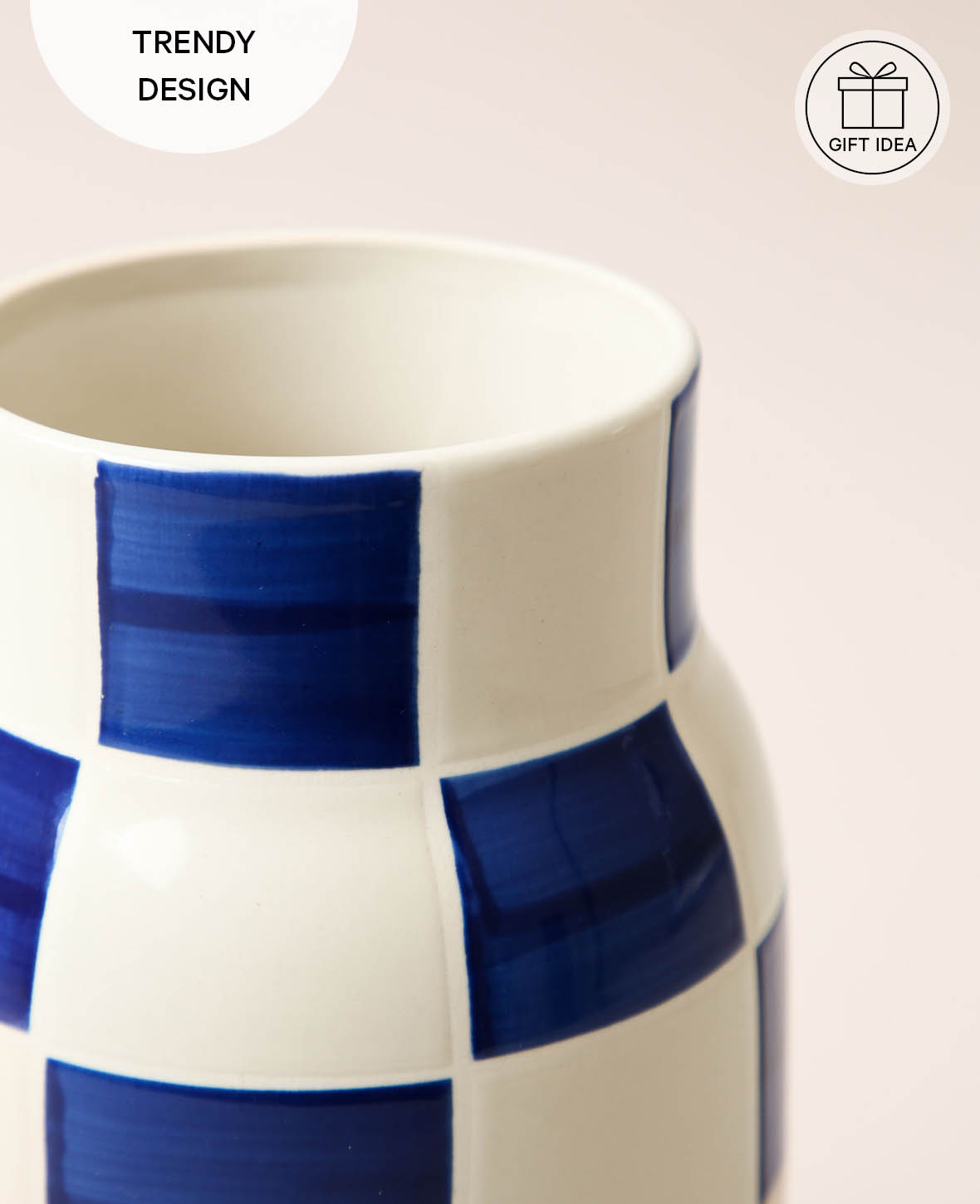 Notre vase en céramique à carreaux bleus et blancs très tendance, H 25 cm x Ø 14 cm, ajoute une touche moderne à ton intérieur. Ce vase haut est parfait pour les grands bouquets de fleurs, les fleurs individuelles ou les branches décoratives. Fabriqué en céramique de haute qualité et émaillé, il enthousiasme par son design élégant. Mets habilement l'accent avec ce vase et laisse tes fleurs s'épanouir dans toute leur splendeur.