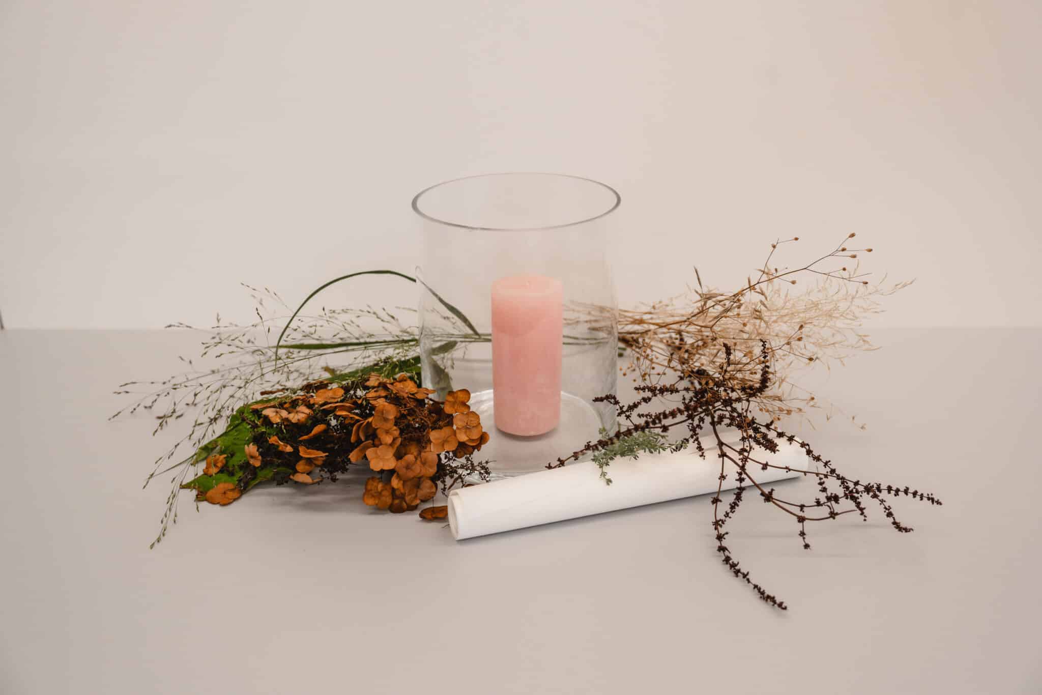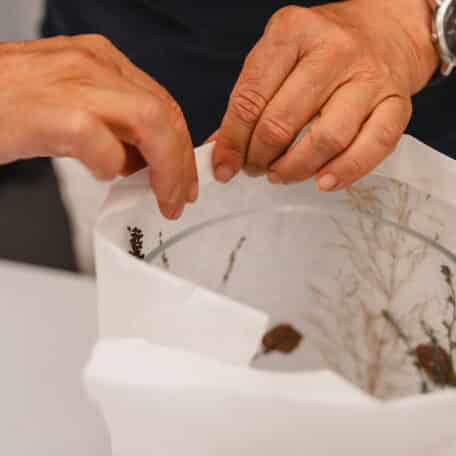 Mesure d'abord la taille de la circonférence du vase et la quantité de papier sulfurisé dont tu as besoin. Colle le papier sulfurisé sur la table avec du scotch, il restera ainsi en place. Tu peux maintenant disposer joliment les herbes séchées, les feuilles, les fleurs, etc. et les fixer au papier sulfurisé avec du scotch ou du ruban adhésif double face.