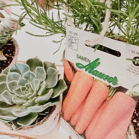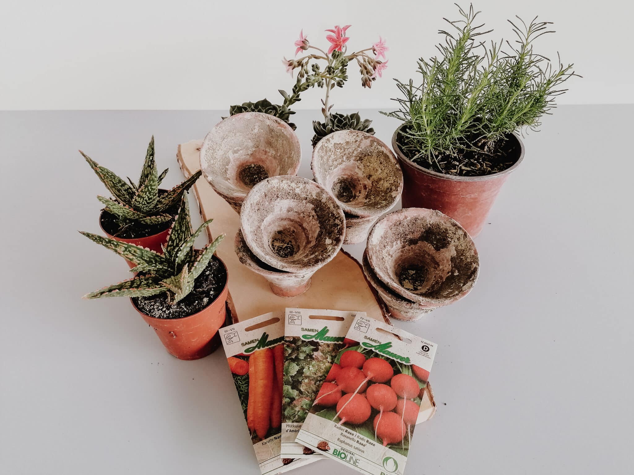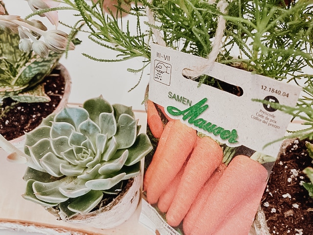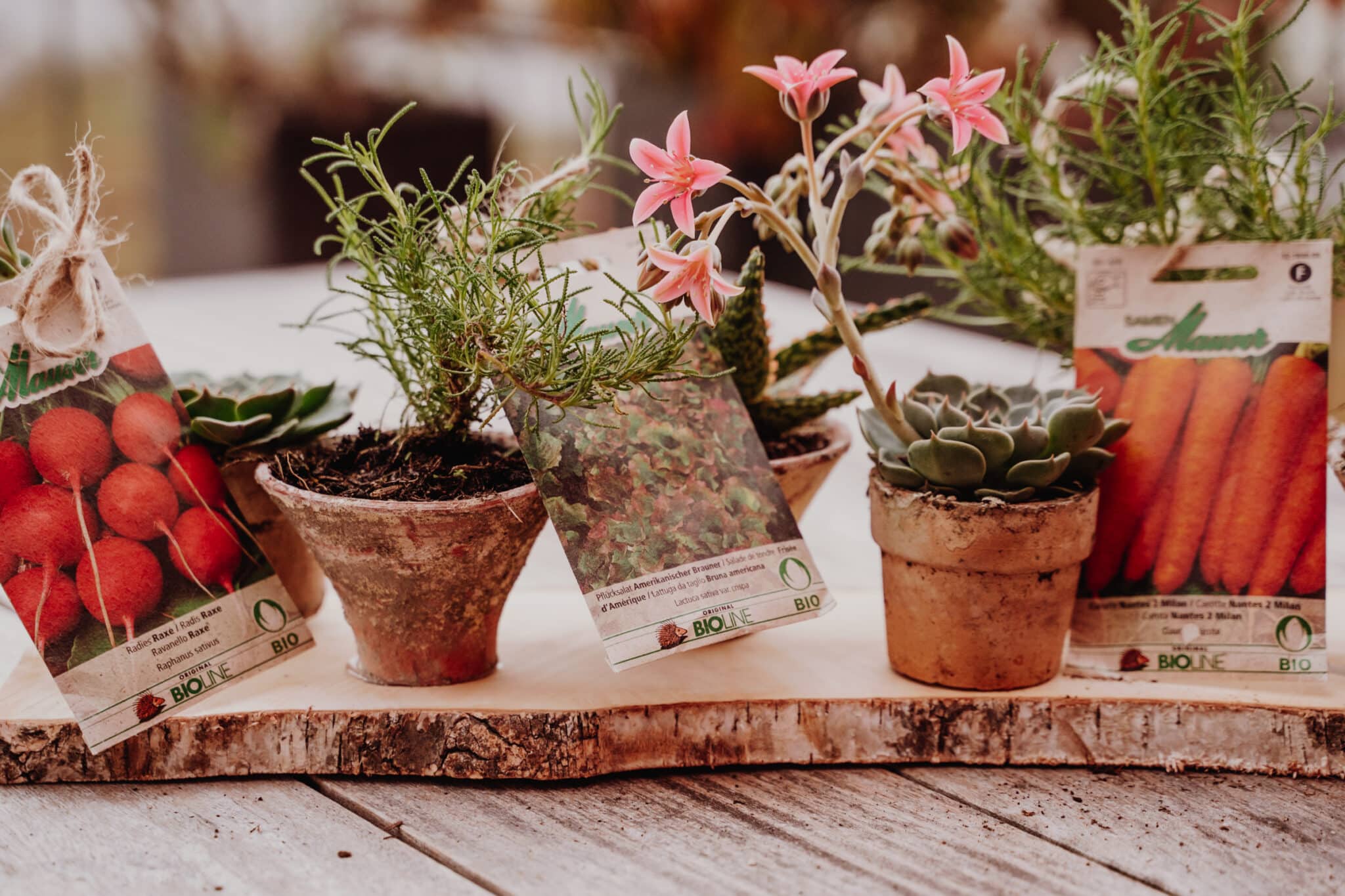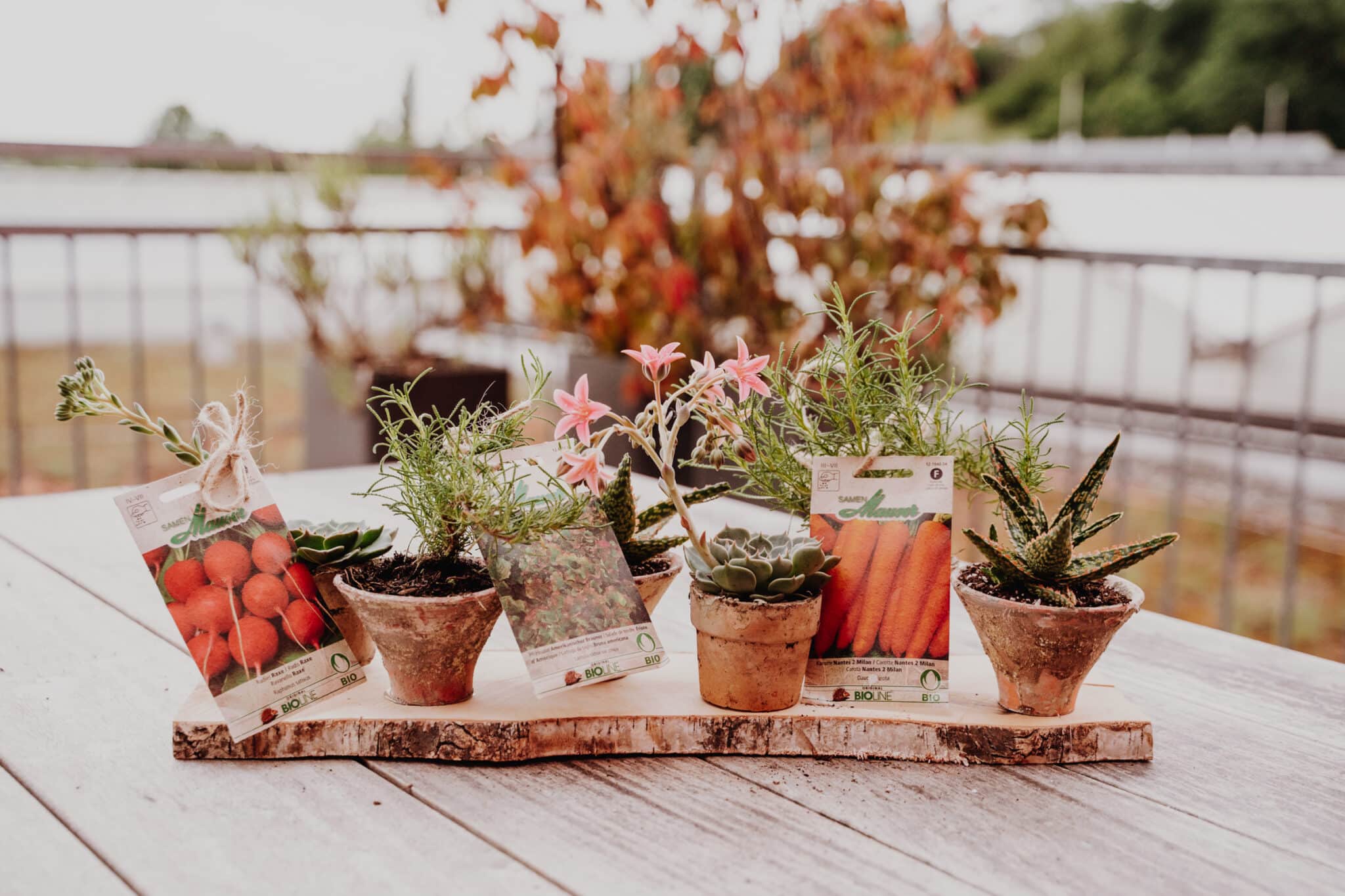 Un cadeau facile à transporter, car tout est bien attaché. Pour les plantes, tu peux choisir des herbes fraîches au lieu de plantes d'extérieur.