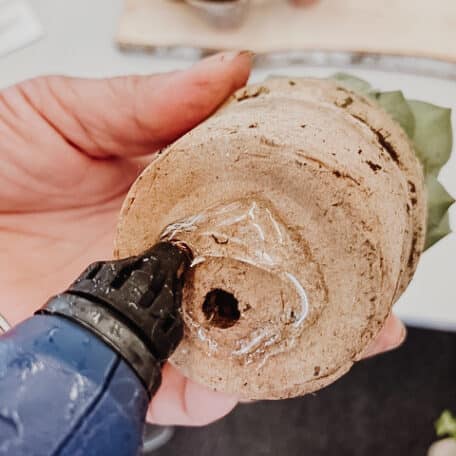 Fixe les petits pots plantés sur la planche en bois avec de la colle chaude.