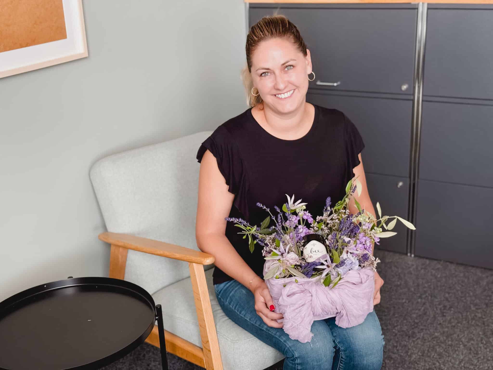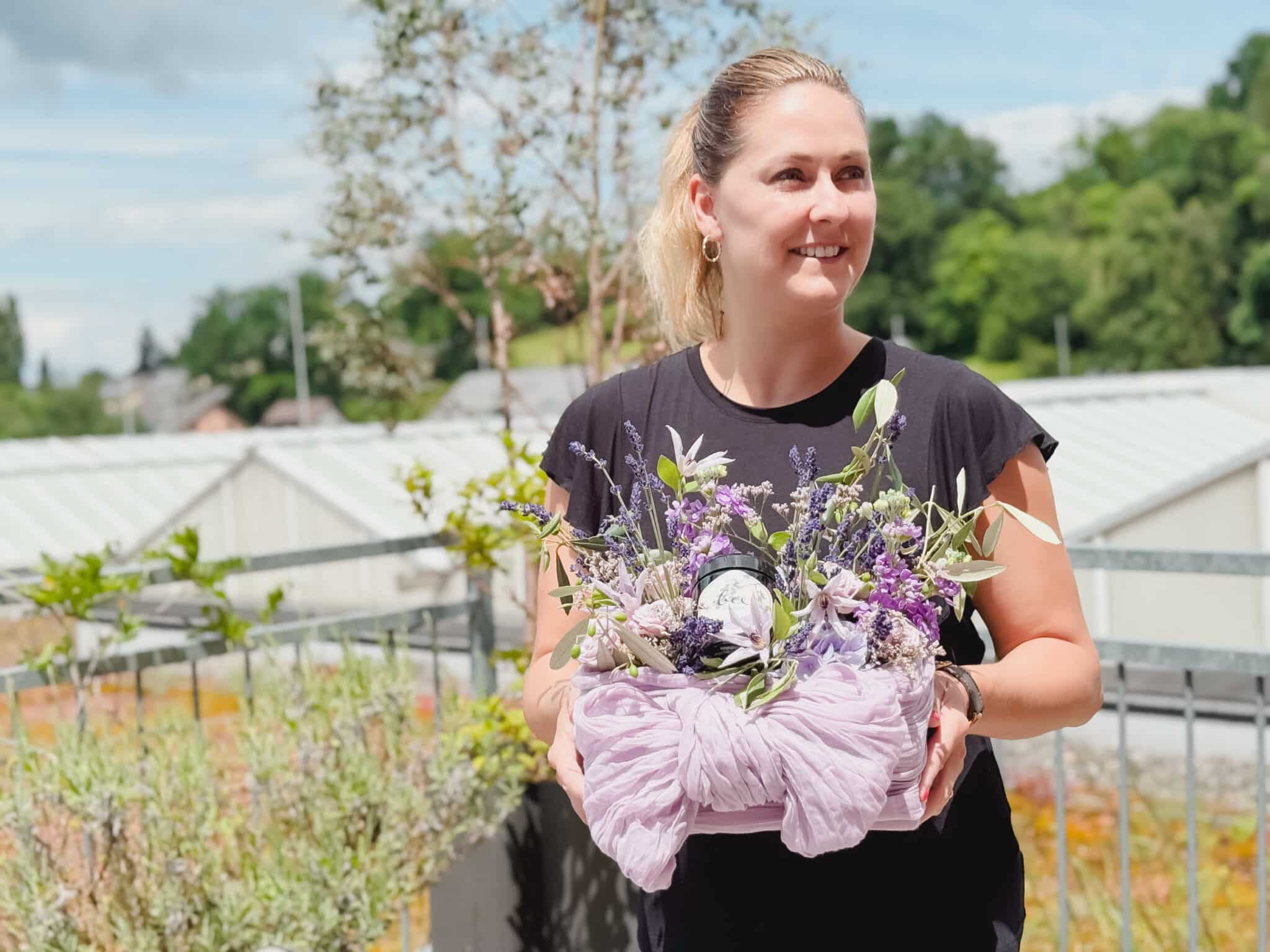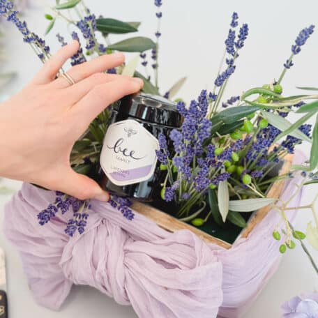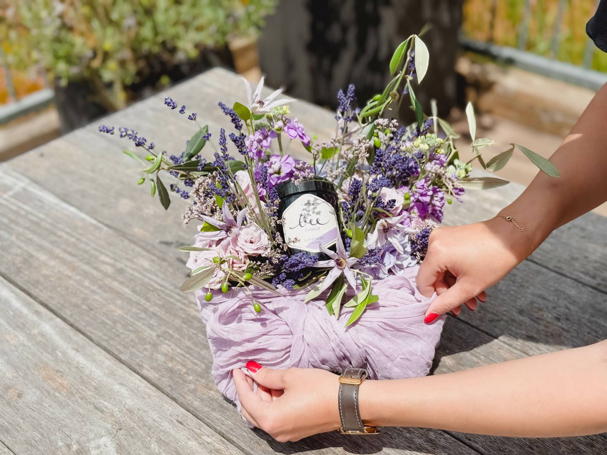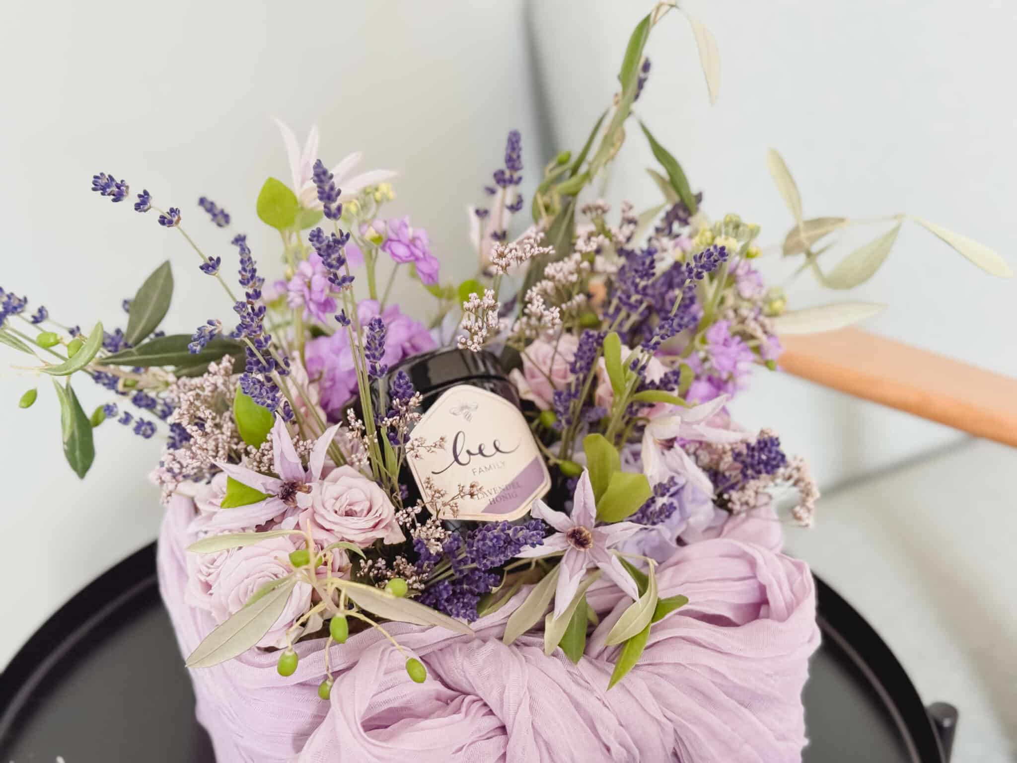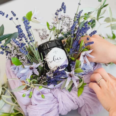 Décore le récipient avec les autres fleurs jusqu'à ce qu'il n'y ait plus de mousse de bouturage et que tu sois satisfait du résultat final. Il est important que la lavande soit bien visible, car il s'agit bien de miel de lavande.