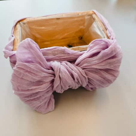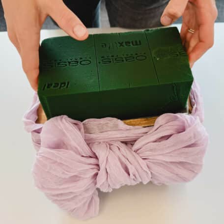 Forme une maille avec les extrémités. Découpe la mousse de manière à ce qu'elle s'adapte au récipient. Tu éviteras ainsi qu'elle ne détrempe le tissu plus tard.